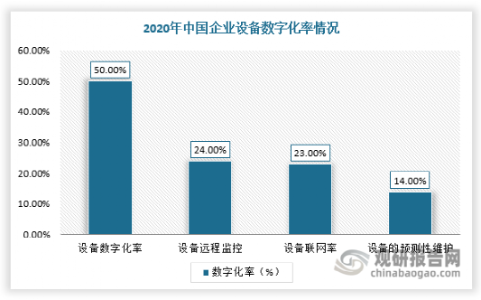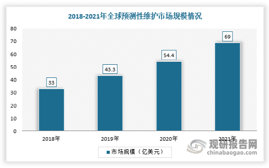 2018-2021年,随着传感器、大数据、边缘计算等技术逐渐成熟及物联网基础设施成本持续下降,全球预测性维护行业快速发展,2021年市场规模达到69亿美元。而在国内市场,我国智能运维行业渗透率较低,虽然近几年国产企业数字化水平大幅改进,2020年企业设备数字化率为50%,但是同年的制造业中实行预测性维护的企业占比仅为14%,所以我国工业设备智能运维行业仍处于早期阶段。